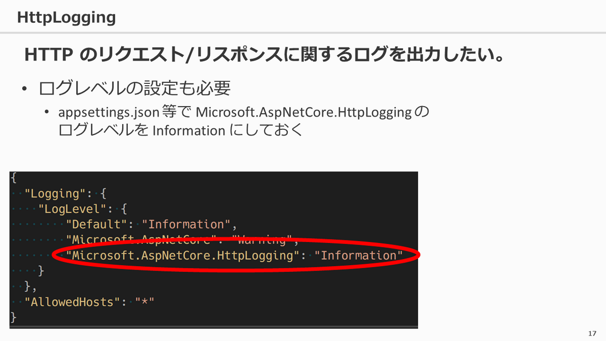 HttpLogging を使うにはもう一ついれないといけない設定があります。