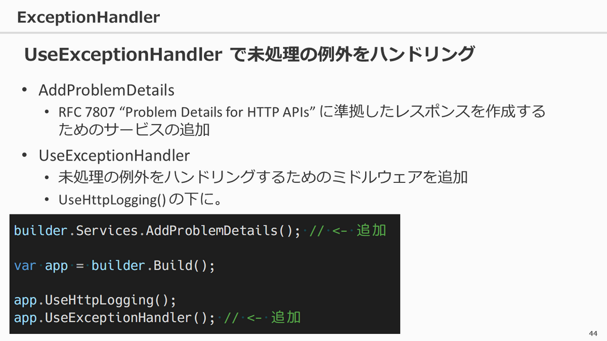 次に UseExceptionHandler をリクエストパイプラインに組み込みます。